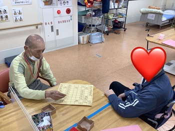 普段はなかなかできないのですが、利用者様同士で将棋をしました。この後職員とも対決し見事利用者様の勝利でした。