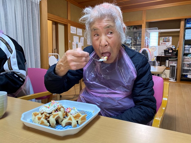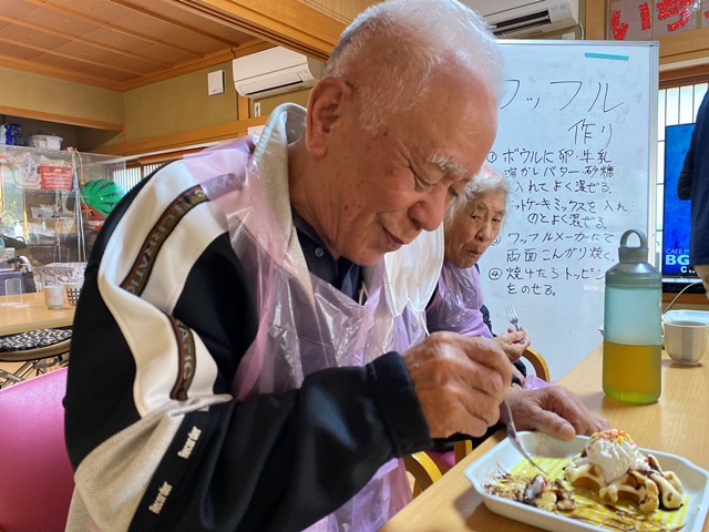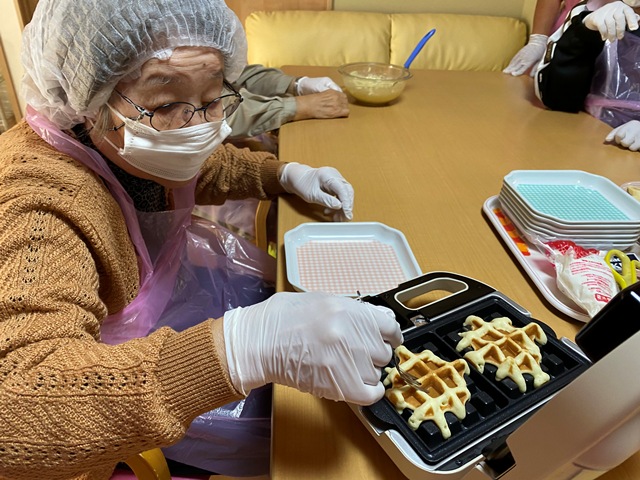 ワッフル作りを行いました♪ 「初めて食べたわ!」「とっても美味しい!」 と大好評でした。 生地を皆さまで混ぜてワッフルメーカーに流して焼いて…