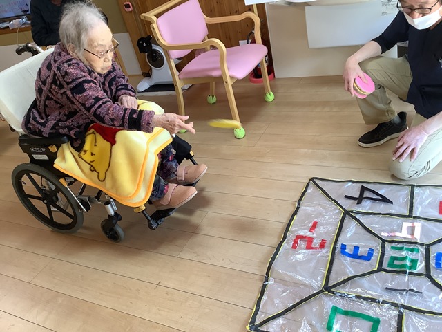 レクリエーションで的入れゲームをしました。 おじゃみと円盤を投げましたが円盤は着地したあところころと転がっていってしまいなかなか難しそうでした!