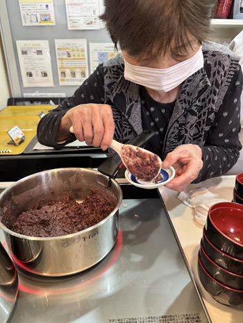 小豆から煮てあんこを作りました。味付けもお願いし「これでいいかな?」「もう少し入れた方がいいかな?」と職員と相談しながら作っています。