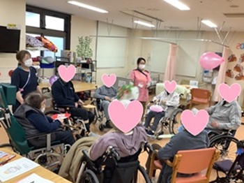 風船バレーに挑戦!うちわを使い上肢の運動も兼ねて楽しみました。連続30回に挑戦し、職員も汗をかきながら達成!